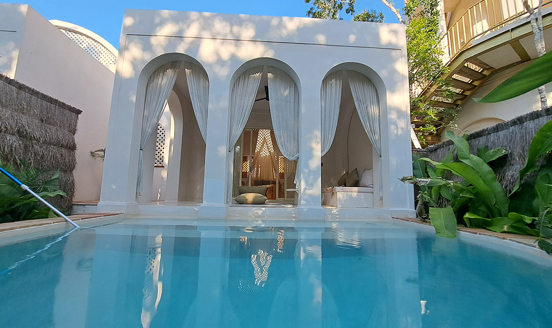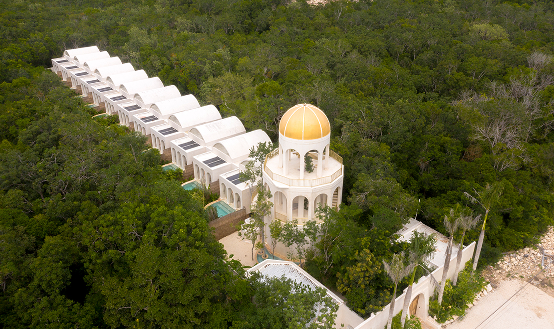 Las fotografías de Martín Hernández capturan la esencia del diseño moderno y minimalista del hotel, perfectamente integrado en el entorno natural de Tulum.